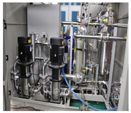 水冷分内循环和外循环两部分。内循环部分,变频器功率单元采用水冷板散热,去离子水通过管道进入水冷板,将IGBT等功率元件热量传递给去离子水后,由去离子水带走,进入水-水热交换器,水-水热交换器通过和外循环水换热,把热量由外循环水带走,冷水进入单元水冷板继续循环。内水循环装置如下图所示。