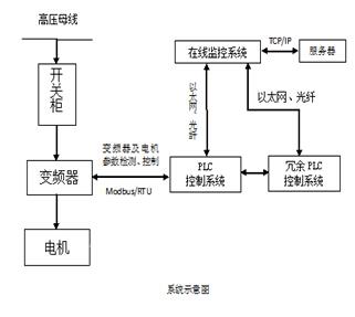 自动控制系统:设备监控核心采用西门子S7系列可编程控制器,结合现场传感器和设备控制接口实现电机及附属设备的逻辑控制和运行状态、参数的实时在线监测,并采用PLC冗余系统,自动切换。PLC系统实时采集高压变频器的运行状态,并实时控制变频器运行。