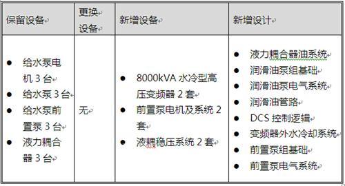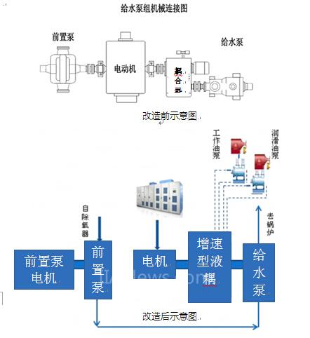 给水泵电动机增加水冷型高压变频器,保留给水泵液力耦合器,将液耦改造为增速齿轮箱;给水泵由水冷型高压变频器调速。