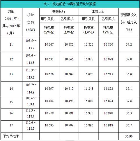 引风机变频改造工程于2012年1月一次成功投运,改造达到了预期目的。以下是3#机组甲、乙引风机高压变频器运行后,对改造前和改造后的机组生产数据进行比较,负荷基本相同,改造前后3#锅炉运行统计数据如表2所示。