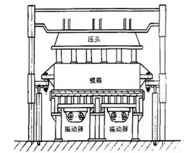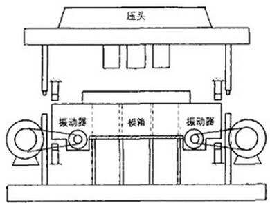 按振动源作用的位置不同,砌块成型机可分为台振机及模振机。振动源直接作用于振动台的机型称为台振机,型号以“QT”开头。振动源安装在模箱上的机型称为模振机,型号以“QM”开头。因台振机具有产量大、砌块平均损耗振动功率小等优点,已成为国内砖机厂家的主流机型。图一、图二分别为台振及模振机构简图。以台振机为例,一般振动器是由电动机或液压马达来驱动,通过振动器中的两根带有偏心块的轴产生相向的高速转动,水平方向的离心力互相抵消、垂直方向的离心力互相叠加,从而产生垂直定向振动。成型砌块较少时,模箱下可设一个振动源;成型砌块较多时,可设两个或多个振动源。