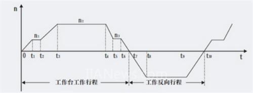 图1中表示了铣床工作台工作铣削行程和返回过程 的变化。0-T1铣床工作台空行程起动,T1-T2铣床工作台以稳定