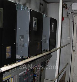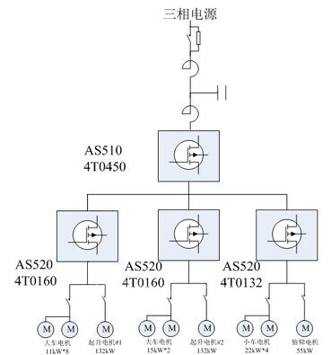 外二130岸桥坐落于上港集团振东集装箱码头分公司,该岸桥按照40t载重进行设计,包含起升机构,小车机构,大车机构以及俯仰机构。起升机构由2台132kW电机组成,分别采用2台AS520 4T0160 新时达港机专用变频器驱动单元控制。大车机构分为2部分,其中一部分为8个18.5kW的电机,与起升1共用一台160kw变频器;另外一部分为2个15kW的电机,与起升2共用一台160kw变频器。小车机构为自行式结构设计,4台22kW电机安装在小车车架上,由一台AS520 4T0132 变频器单元驱动。俯仰机构采用1台55kw电机,与小车共用一台132kw变频器。
