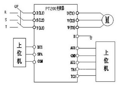 欧科PT200系列变频器采用高精度矢量控制,低频大转矩,多种频率给定通道,调速精度高达0.01HZ,宽范围载波可调,能使电机噪声更小,多功能数字输出通道,可根据具体要求设置参数功能,保护功能齐全,输入输出缺相保护,过流,过压,短路保护,让运行更加稳定安全。通过对现场的应用了解,利用变频器的外部端子控制启停,AI1给定频率,AO1反馈当前运行频率,SPA输出变频器运行信号,继电器功能设置为变频器故障输出。