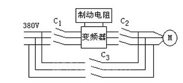 为使变频器故障时不耽误生产,可加工工频旁路,其应用示意图如图1所示。变频器运行时,开关C1和C2全部合闸,C3断开;变频器故障时C1和C2断开,C3合闸;变频器运行,C3和C1,C2联锁,不会发生合闸的情况。