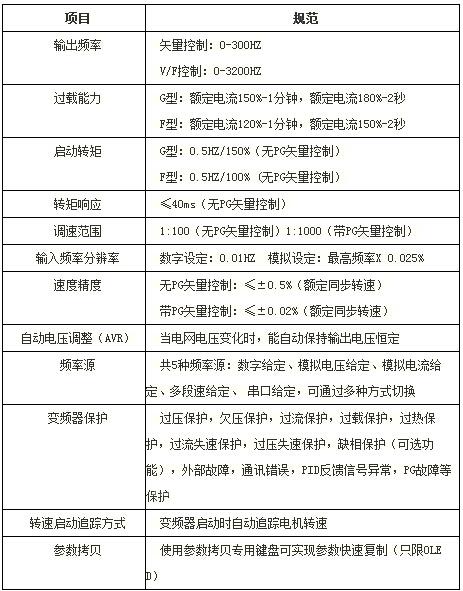 PI9200系列变频器是普传科技新研发的一款高性能电流矢量变频器,具有V/F、无PG 矢量和带PG 矢量三种控制方式,其中在突加减载荷的情况下,速度波动非常轻微;适用于三相交流异步电动机和永磁同步电机,可以为用户减少库存,不再需要为不同的电机备用不同变频器的库存;具有准确的电机参数自学习功能,支持全面自学习与静止自学习,其中静止自学习可以在电机无法脱开负载的场合准确的学习电机的参数;具有上电外围设备安全自检,逐波限流,定时控制等个性化功能,使电机运行更平稳,噪音更小;其他的特性参数、功能如下表所示: