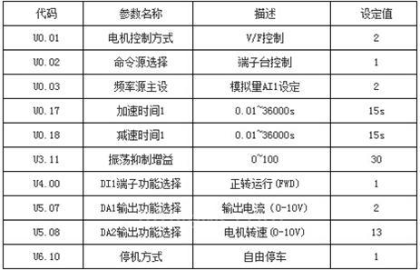 按照主回路与控制回路接线完毕,上电后根据电机铭牌参数输入电机参数组,电机参数自学习设置为静止自学习;设置变频器运行参数,设置控制方式为V/F 控制方式,命令源为端子台控制、频率源为模拟量电压是定,运行频率根据需求设置,加减速时间设置为15秒、电机类型设置为普通异步电机。