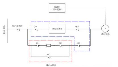 变频调速系统由用户开关、手动旁路柜、水阻柜、高压变频器、高压电机组成。手动旁路柜是由三个高压隔离开关QS1、QS2、QS3组成。电机以变频方式运行时, QS1、QS2闭合,QS3断开;电机以工频方式运行时,QS3闭合, QS1、QS2断开。手动旁路柜严格按照“五防”联锁要求设计,变频输出开关QS2和工频开关QS3互锁,完全能够保证变频调速系统安全运行。