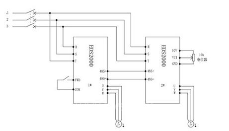 假设1#变频器为主机,带动上电机(负荷较重的电机),2#为从机,带动下电机(负荷较轻的电机)。