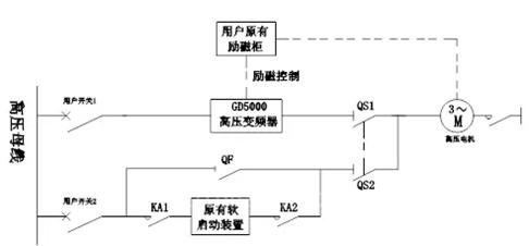 整个切换方案用户原有变频软起、KA1、KA2、QF、原有励磁柜和新上变频器、手动刀闸QS1、QS2组成。在变频运行时QS1合闸QS2断开。当变频器出现故障时用户原有软启动部分启动后进行工频运行,此时QS2合闸QS1断开。QS1和QS2电气连锁能够保证五联防要求。