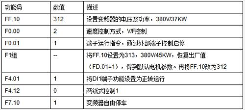 应用时需配合客户的电气控制柜,可实现工变频切换。变频运行时,启动指令由控制柜上的启动按键给定,所以变频器设定为端子运行指令。停止指令由停止按钮给定,客户需要即按即停,停车方式设置为自由停车。变频器运行频率为键盘给定,可以根据油井的实际情况自动调节频率。