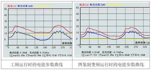 上表为客户的监控系统上的电能参数曲线,此曲线显示的为一个冲程周期内的电流,电压,功率的曲线图。对比工频运行和变频运行时的电能参数曲线,由对比表中直观的看到,相对于工频运行,电流,功率等都有大幅度的降低。