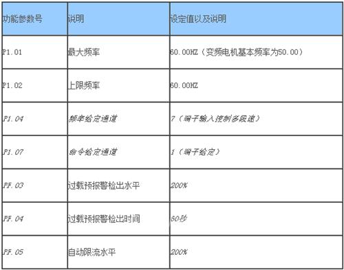 此现场的电机无法脱开机械负载,不能进行电机参数自学习,因此采用V/F控制,停机方式为自由停机。将电机额定转速设置为1500转/分;变频器和电机功率1:1匹配、变频器内部有完善的过流保护和反时限过载保护,将PF.03过载预报警检出水平设置为200%、PF.04过载预报警检出时间设置为60秒、PF.05自动限流水平设置为200%。