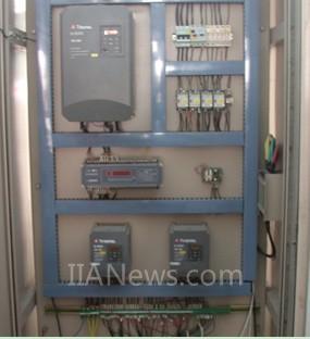 在无纺针刺机中影响产品质量的主要工艺参数为:针刺深度和针刺密度。现厂家使用台安的N2-430(22Kw)变频器通过皮带拖动控制针板工作。工作频率在30Hz左右,针刺频率约为800刺/分。而且针板的动作频率可随各种无纺布的工艺要求而改变,在生产中能保证无纺布的密度和强度,完全达到无纺布的工艺要求。