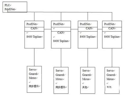 从拓扑图可以看出,PLC系统是通过ProfitNet与4台8400 TopLine建立通信的。其中两台8400 TopLine控制器用于完成升降。PLC通过ProfitNet发送命令至升降控制的主机,主机通过CAN总线把主机的位置值发送到升降的从机,主机在控制器主要进行速度跟随控制,而从机则接受主机通过CAN总线传递过来的位置做位置跟随控制,从而实现位置同步。在做同步跟随之前,主机和从机都需要做位置清零的命令,保证在整个行程过程中保持位置的同步,以借此进一步保证主从控制器驱动的伺服减速机带动的丝杆不会由于位置的不同步而受到扭力。在升降控制的控制器中,PLC通过ProfitNet只发送命令到升降控制器的主机;另外两个8400 TopLine夹包控制器需要完成的是力矩跟随控制和速度跟随控制两种控制方式。在夹紧控制中,需要做两次夹包控制。第一次是碰到烟箱时以较小的力矩停下来,第二次夹包是用较大的力矩把两箱烟包夹紧,以免掉下来。