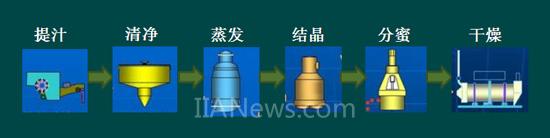 甘蔗制糖工序一般包括提汁、清净、蒸发、结晶、分蜜和干燥。具体如下图示:
