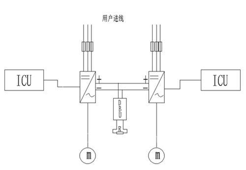 主传动系统两台90kW电机组成分别由两台GD800-11-0090-4,卷取机为速度控制,开卷机为速度控制、力矩限幅模式,保证在断带状况下不飞车。由于开卷电机一直处于发电状态,因此,通过共直流母线方式,把开卷电机把多余能量通过直流母线传导给卷取电机,减少能量损耗,节能。