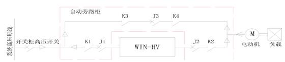 (4)在工频旁路运行状况下J3闭合,J2、J1断开。如需自动切换至变频运行,此时由电气线路控制先跳闸10kV开关柜,再断开J3,然后依次闭合J2、J1,再合闸开关柜,启动变频器,完成由工频旁路运行到变频运行的自动切换。