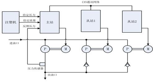 主机工作设置为流量或者压力控制模式。当油压还没有建立起来的时候,管路尚有空间,此时,主机在流量控制模式下,用流量正比于转速的方式运行油泵,主机、从机于相同的转速运行,使得管路很快充满油,建立起油压。当油压建立后,主机工作在压力控制模式下,单独PID控制运行,从机待机,油压可以稳定在给定值。