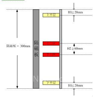 1) 距离数据:推荐隔磁板长度为300mm;H1 ≤ 20mm; H2 ≥ 60mm;