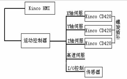 上位机采用客户自行研制的控制器,实现 4 轴伺服控制(含 3 轴的螺旋插补)和 I/O 控制,详细方案原理如下图所示。