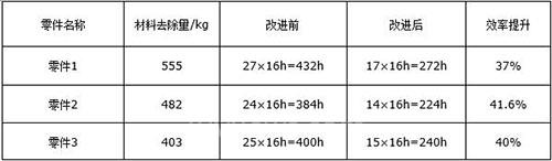 具体举例:某新研型号起落架为串联式结构,其主要承力构件材料均采用了TC18钛合金材料,单机数量18件,零件结构复杂,数量多,材料去除量大,且毛坯加工余量分布不均匀,欠压部位多(见表3钛合金材料去除量),毛坯表面存在α+β相层,在锻打过程中位错强化,表面硬度高(HRC﹥55),厚度为0.1-0.15mm(如图1),研制初期单件加工周期在410h左右,加工效率低下。而近年来,随着该型号转入小批生产,交付数量增多,交付周期缩短,如何在现有设备、人员不变的情况下,缩短交付周期,提升交付进度,降低生产成本,更是公司急需解决的难题。