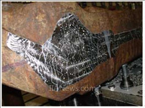 选择的原则有了,按说,事情的进展应该一帆风顺;不料,事实却并非如此:结合公司数控设备的现状,我们最初选用了某知名品牌可转位硬质合金涂层刀具,并按其推荐的切削参数进行加工。然而,结果却不尽人意——由于零件来料状态为模锻件,表面有热处理氧化层,且余量分布不均匀,加工时刀片磨损严重,加工不到2小时刀具就产生不同程度的磨损及崩刃现象,无法满足批量生产的加工需求。这种情况的出现,让难题的破解一时陷入僵局。