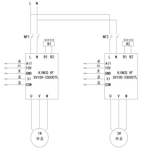 2 台变频器为一组,每个变频器拖动一个转盘。当其中一个转盘线收满,自动换盘到另一个盘。在自动换盘过程中,要求变频器对信号的采集,反应出的频率速度要高度一致。如果一个慢或快了,或造成松卷或断线情况。