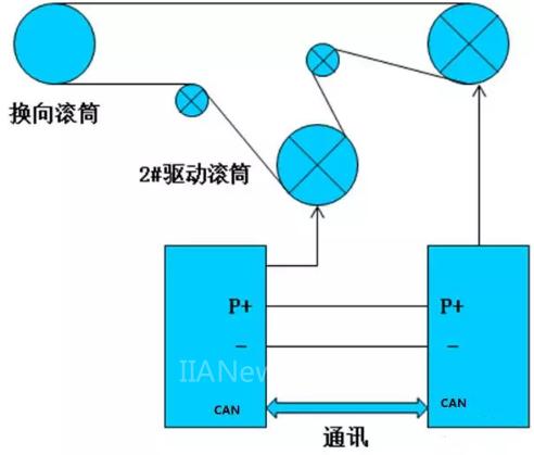 主/从控制是由两个或者多个驱动单元共同控制一套系统,其电机轴通过齿轮、链条或者传输带链接在一起,在各驱动单元之间实现平均分配负载。外部控制部分作用在主机,主机与从机之间通过线缆进行通讯。
