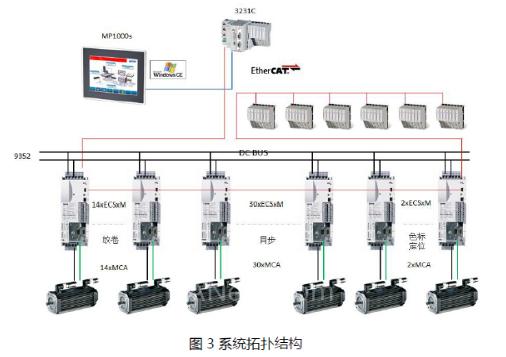 Lenze驱动系统解决方案在合作伙伴培新机械得到了成功应用,以600片全伺服婴儿纸尿裤为例,系统以3200运动控制器为核心,组态控制46台ECS伺服控制器,其中跟随虚轴做同步运行的电机实现材料的输送、分切、色标定位,独立控制的电机实现材料开卷甚至成品堆垛和入袋装箱部分的应用。运动控制逻辑部分采用Lenze标准功能模板,提高了程序的通用性、重复利用和可移植性。系统采用分布式时钟同步,确保轴模块可周期性接收到位置信息并同步刷新控制数据,保证了同步轴的精确跟随,模态轴的建立使跟随轴的位置周期性清零,有效避免了累计误差的产生。