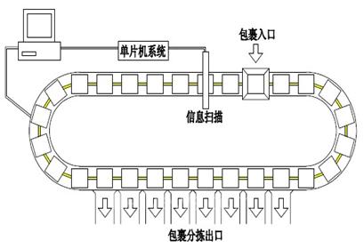 每个邮包面上均贴有条形码,由上件装置将邮包输送到分拣装置上,分拣用的皮带输送机由链条牵引,在分拣轨道上移动,经过条形码扫描仪时,邮包分拣信息由条形码扫描仪采集到计算机控制系统中,在其中进行数据分析处理,由单片机控制计算出邮包到达指定分拣格口所需要的时间,以便邮包到达分拣格口时计算机控制系统发出信号,通过控制电动滚筒启动皮带输送机把邮包分拣到指定格口达到分拣目的。如下图所示。