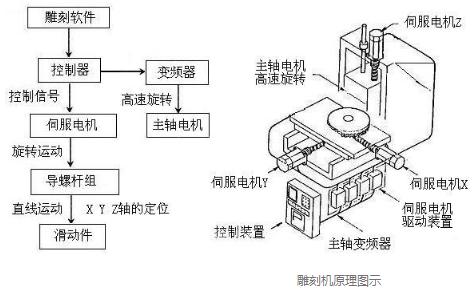 当今主流数控雕刻机是由计算机、雕刻机控制器、雕刻机主体三部分组成,其工作原理是通过计算机内配置的专用雕刻软件进行图样设计和排版,经由计算机把设计与排版的信息传送至雕刻机控制器中,再由控制器把这些信息转化成能驱动步进电机或伺服电机的脉冲信号,控制雕刻机主体上X、Y、Z三轴的雕刻走刀定位。同时,控制器启动变频器,带动主轴电机的雕刻头高速旋转,对固定于主机工作台上的加工材料进行切削、钻铣,即可雕刻出在计算机中设计的各种平面或立体的浮雕图形及文字,实现雕刻自动化作业,按照不同的加工材质和工艺要求,可以搭配不同的专用配置刀具。