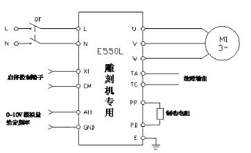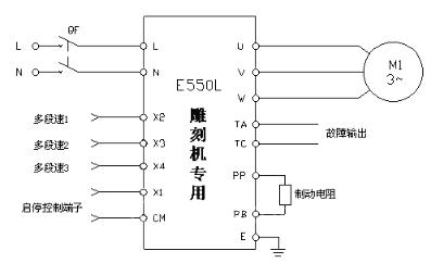 雕刻机供电系统有单相220V和三相380V。大多数机型采用单相220V供电。电气接线方式根据频率源给定方式的不同,分为以下两种: