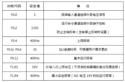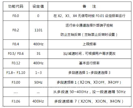雕刻机专用变频器固化了多段速给定方式参数,默认出厂值,无需设置,接线后便可使用,参数如下: