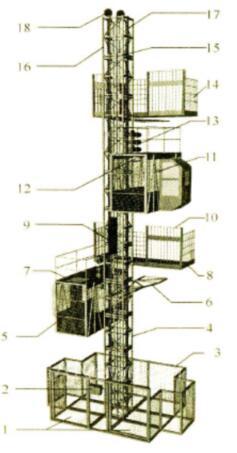 1—地面防护围栏门;2—开关箱;3—地面防护栏;4—导轨架标准节;5—吊笼门;6—附墙架;7—紧急逃离门;8—层站;9—对重;10—层门;11—吊笼;12—防坠安全器;13—传动系统;14—层站栏杆;15—对重导轨;16—导轨;17—齿条;18—天轮