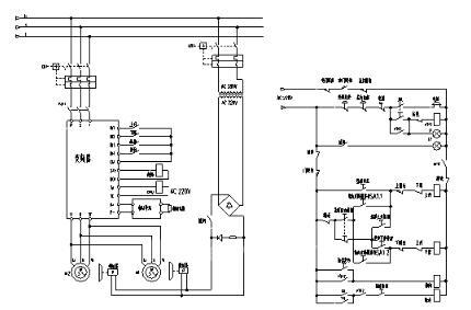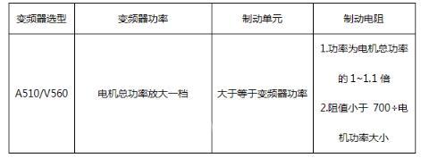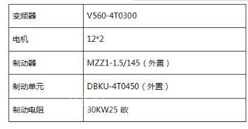采用V560-4T0300一拖二的控制方式。(即V560-4T0300 采用V/F控制同时驱动2台12KW的电机),系统外置电磁制动器,由变频器控制制动器的松闸和抱闸信号。