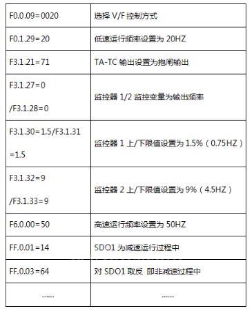 (3)设置松闸和抱闸频率。设置原则是从高往低设置(一般是从8HZ以下),设置频率需要平衡三个要素,第一个是松闸不溜钩(即频率不能设置太小);第二松闸或者抱闸瞬间电流不易太大(冲击电流稳定在1.5倍的额定电流以内),这需要松闸抱闸频率不易太大;第三个需要考虑启动和抱闸的舒适性,这个要求抱闸或者松闸的频率不宜过大。综合这三个因数来匹配参数。