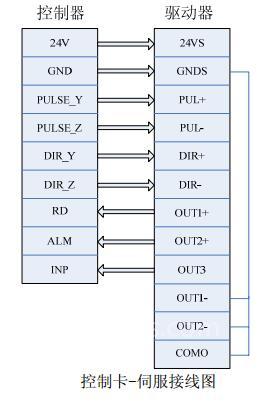 伺服 24V 逻辑电由控制卡直接提供,伺服脉冲信号及数字输入输出信号与控制卡对应连接。