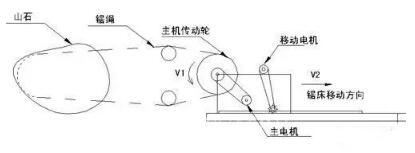 金刚石绳锯机是采用主电机带动锯绳沿近似跑道型的轨迹运行,锯绳套在已经凿开缝的石头山上,移动电机经减速器带动整个锯床以一定的速度沿石头被锯开的方向向后移动。移动速度必须根据主电机的负荷状况和锯绳所需的张紧力适时进行调整,如果移动速度太快,主电机负载增大,甚至过载,锯绳承受的张力也会增大,如不及时调整速度就会绷断锯绳。
