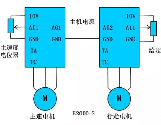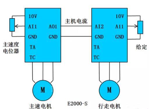 主电机变频器的频率通过外部电位器调节,移动电机变频器的频率通过AI1-AI2调节,其中AI1为外部电位器给定,AI2为主电机实际运行电流经主变频器模拟量输出口AO2输出给移动电机变频器,移动电机变频器将这两个信号叠加处理,可以实时的根据主机电流变化调整转速,以保证主机电流相对稳定。变频器端子接线及参数设置如下: