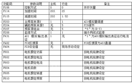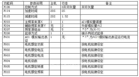 行走电机的行走速度由变频器内置PID根据锯绳的负荷自动完成,行走电机手动给定AI1,实际负荷AI2输入反馈(主机运行电流),PID控制(负反馈) AI1-AI2=0,调试简单,响应快,可以保证主机电流稳定。变频器端子接线及参数设置如下: