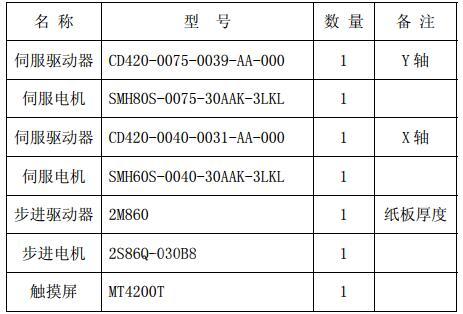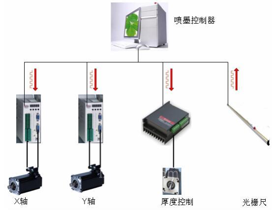 设备外观见图2。整套系统采用 X、Y 两轴伺服,外加一套步进电机。Y 轴伺服控制瓦楞纸的前进,X 轴伺服控制墨盒来回运动,步进电机控制进纸厚度,整套动作类似于打印机。X 轴方向采用全闭环的结构,外加光栅尺来检测墨盒的实际位置,实现高精度控制。