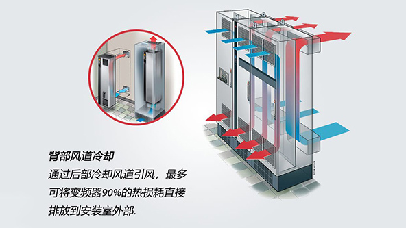 此外,丹佛斯变频器通过柜机背部风道将冷却空气经过散热片散热的设计,可将最多90%的热损失直接排到机箱外部,最大限度减少流经电子元件区域的空气。