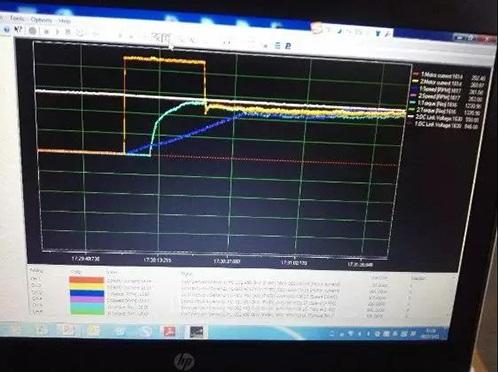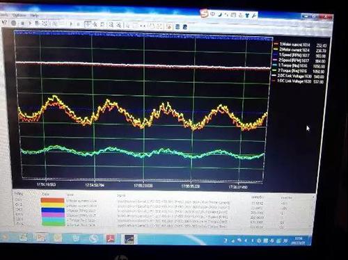 丹佛斯变频器负荷共享功能的优势在下图照片中可见,两台机器的负载电流、转矩曲线,无论升速还是降速都是重合的。