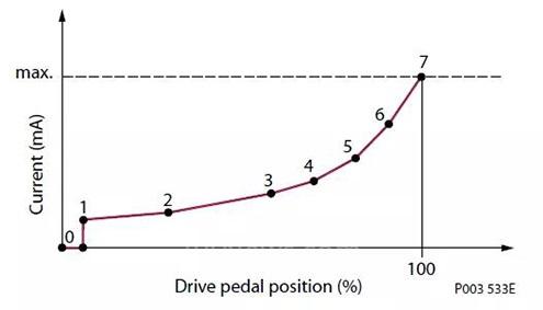 这种模式主要使用在扫路工况,通过手油门将发动机转速设定在某一个值,脚踏板设定油泵排量。H1P ACⅡ控制油泵内部带斜盘摆角传感器,转速传感器,温度传感器。通过油泵内部的斜盘摆角传感器做反馈,将油泵变成EDC控制模式,同时通过温度、转速以及压力的补偿保证车速基本上恒定某一范围内。
