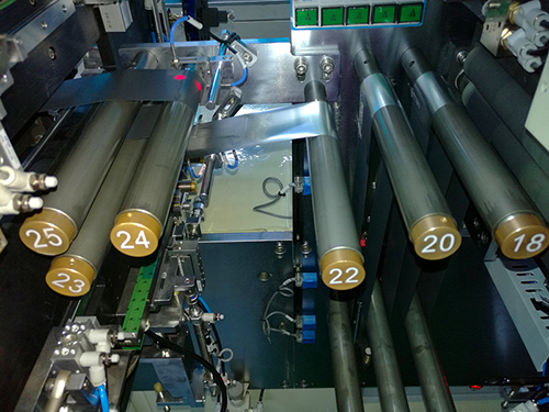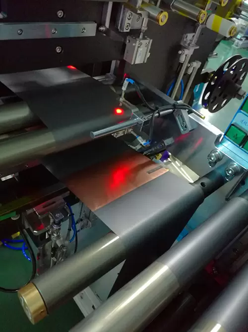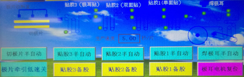 主要工艺过程为:自动放卷---焊前纠偏---送极耳---焊极耳---贴胶1---贴胶2---贴胶3(极耳贴)---纠偏---切片或收卷。