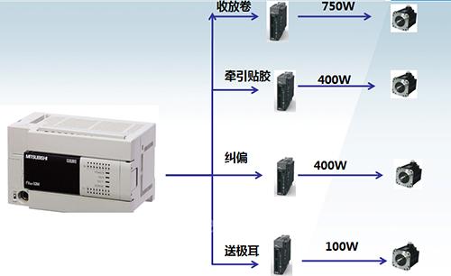 2.牵引胶贴:位置控制,光电扫描极片表面上升沿信号,给到PLC,中断触发,一定数量的脉冲给到伺服定长运行。