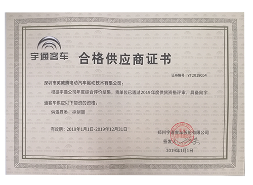 自2015年,深圳市英威腾电动汽车驱动技术有限公司正式成为宇通客车的合格供应商以来,以先进的产品性能和品质、及时的交货周期、优质的服务质量,为宇通纯电动客车、垃圾车、洗扫车、扫路车、清洗车提供的动力总成系统解决方案,迅速赢得了宇通公司的肯定,连续数年为英威腾颁发“合格供应商证书”。