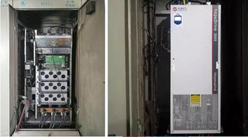 该高炉卷扬设备电机原使用某国际品牌6se70系列400kW变频器驱动,由于长时间使用,设备故障率高且缺乏备件,严重影响生产。此次采用禾望变频器进行替换改造,无需更换上位机代码、柜体结构、主功率走线等情况下,于一天内实现无缝替换。完美适应高炉卷扬的高启动转矩、严格的启停速度与位置、高稳定性等要求,顺利地进行了焦炭、矿物等不同负重(轻载、重载、过载)以及高低速运行等工况测试,同时在机械抱闸装置出现故障能够及时保护避免溜车,得到了领域专家的高度肯定。