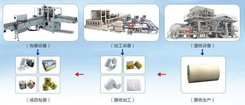 造纸厂的出厂产品,一般是重量一吨以上的大卷"原纸",而纸巾加工生产线,一般是从复卷机或折叠机开始,中间有大回旋切纸机,将切好的纸巾用输送带传送至包装机,包装之后还要进行装箱等一系列后加工工序之后,才能运往各大商超进行销售( 过程如上图所示)。